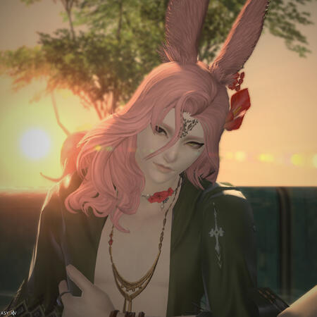 . SOCIALLY INEPT . Raffyr is a serial people watcher. He finds himself more without than within when it comes to social settings. There is an almost painful yank in his chest to socialize, but being on his own so long has slashed any hope he has for making connections seamlessly. He listens, hoping to gleam some kind of in, something that allows him to find a stranger in Limsa Lominsa and just-talk! Chatter! Banter! Anything!To his friends, Raffyr is wise with a kind smile. He laughs with his chest, and finds connection in skinship, more than generous with a pat on the shoulder or bumping against your hip as you travel aside another. He likes to be useful when he can, happy to lend an ear to troubled souls. He blossoms on the road, finding his tongue easier in small groups than late night clubs full of throbbing music and scream of celebration.. SUBTLE QUIET . He could be described as an old soul, as his youthful appearance is often deceiving to those unfamiliar with the Viera. Raffyr thinks he is exactly the age he should be, but no, he will not tell you. Perhaps his underlying mischievous nature demands a bit of mystery.There is a strange air to him that is only found through observation. Someone who has experienced life much different from those outside the Woods. To other Viera, he is stranger still, a deadly warrior with eyes that see much further than the horizon. There are words he leaves unspoken, tales he does not wish to share, but their ghosts are betrayed by the draw of a blade, the cold breath on his tongue, and a song too old to play.